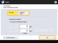 Wählen Sie <Definierte Seiten>, um festgelegte Seiten zu kopieren. Geben Sie die Seiten durch Drücken von <Startseite> oder <Endseite> ein.