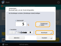 Drücken Sie <Einstellungen ändern>, um die Einstellungen zu ändern. <Musterkopie> wird angezeigt, nachdem die Einstellungen geändert wurden. Drucken Sie eine weitere Testkopie aus.