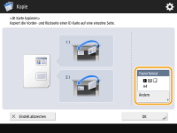 Wenn ein anderes Original in die Zufuhr gelegt ist, können Sie den Kopiervorgang nicht starten. Nehmen Sie das Original aus der Zufuhr heraus. Für <ID Karte kopieren> kann lediglich Papier in den Formaten DIN A4 und DIN A4R verwendet werden. |