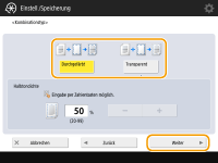 Um das Formbild zu überlagern, ohne die Dichte anzupassen, drücken Sie <Durchgefärbt>. Um das Formbild mit verringerter Dichte zu überlagern, drücken Sie <Transparent>, und passen Sie die Dichte an.