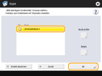 Wenn Sie ein Formbild separat drucken möchten, um die Ausgabe zu prüfen, wählen Sie das Formbild in der Liste aus, und drücken Sie <Druck prüfen>. Wenn Sie die Größe des Formbildes und die Überlagerungseinstellung überprüfen möchten, drücken Sie <Details>.