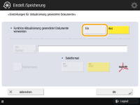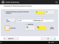 Sie können nicht direkt versenden, wenn <Einstellungen für Aktualisierung gesendeter Dokum.> auf <Ein> gesetzt ist. Diese Einstellung wechselt in den folgenden Fällen zu <Aus>. Geben Sie dann je nach Bedarf das Ziel erneut an oder setzen Sie die Einstellung wieder auf <Ein>. Wenn das Backup-Ziel aus dem Adressbuch gelöscht wurde Wenn ein Adressbuch aus dem Remote UI importiert wurde Importieren/Exportieren von Einstellungsdaten Wenn ein Adressbuch über <Einstellungen Verteil. Geräte-Informationen> Verteilen der Geräteinformationen an andere Canon-Multifunktionsdrucker empfangen wurde |