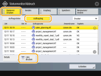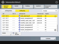 (Statusmonitor/Abbruch) drücken, erscheint der Bildschirm Status Monitor/Abbruch, auf dem Sie den Nutzungsverlauf der jeweiligen Funktion wie beispielsweise Kopieren, Drucken, Senden von E-Mail, Senden/Empfangen von Faxen/I-Faxen, Speichern von Dateien in "Erweiterter Platz" usw. überprüfen können. Über diesen Bildschirm können Sie auch den Nutzungsverlauf der jeweiligen Funktion ausdrucken.![]() |