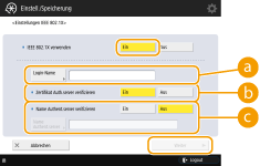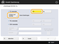 Setzen Sie <IEEE 802.1X verwenden> auf <Ein>, konfigurieren Sie die erforderlichen Einstellungen, und drücken Sie <Weiter>.