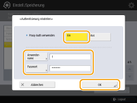 Drücken Sie diese Schaltfläche, und konfigurieren Sie die Authentifizierungsinformationen, um die Authentifizierungsfunktion des Proxyservers zu verwenden. Drücken Sie im eingeblendeten Fenster auf <Ein>, geben Sie den Benutzernamen und das für die Proxyauthentifizierung zu verwendende Passwort ein, und drücken Sie <OK>.