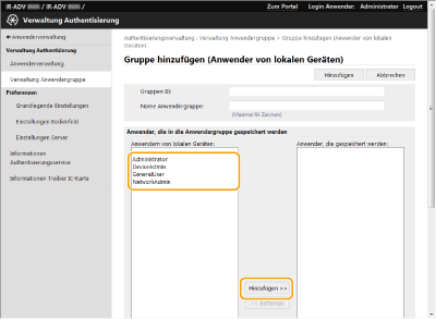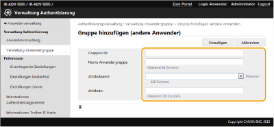 Klicken Sie auf [Anwenderverwaltung]  [Verwaltung Authentisierung]  [Verwaltung Anwendergruppe].