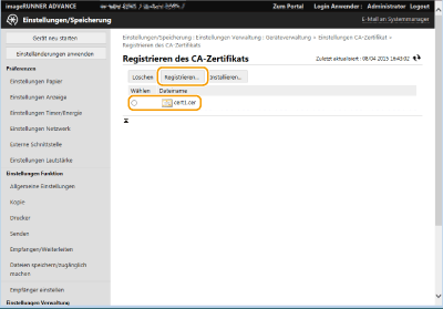 Wählen Sie das CA-Zertifikat, das Sie registrieren möchten, und klicken Sie dann auf [Registrieren...].