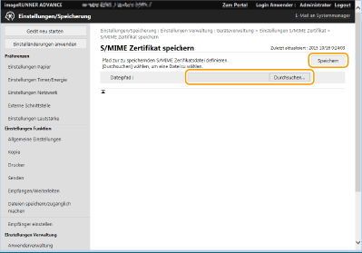 Klicken Sie auf [Durchsuchen...], legen Sie die zu registrierende Datei (S/MIME-Zertifikat) fest, und klicken Sie auf [Speichern].