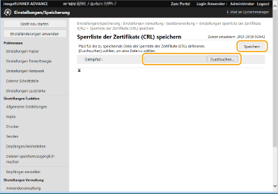 Sie können Remote UI verwenden, um eine Zertifikatsperrliste (CRL) zu registrieren. Weitere Informationen zu Zertifikatsperrlisten, die im Gerät registriert werden können, finden Sie unter