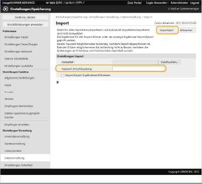 Geben Sie in [Passwort Entschlüsselung] das gleiche Passwort ein, das beim Exportieren der Einstellungsdaten eingegeben wurde.