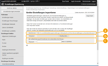 1 | Klicken Sie auf [Einstellungen Gerät (Einstellungen Weiterleitung, Adressbuch, Favoriteneinstellungen Sendefunktion)] in [Individuell importieren/exportieren]. |