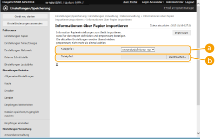 3 | Konfigurieren Sie die erforderlichen Einstellungen. ![]() [Kategorie]Wählen Sie die Papiereinstellinformationen aus. [Dateipfad]Klicken Sie auf [Durchsuchen...], und legen Sie die zu importierende Datei fest. |