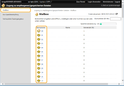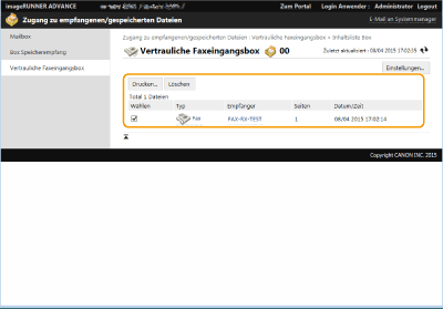 ![]() | Sie können Remote UI verwenden, um in der Mailbox gespeicherte Dateien bzw. vorübergehend in der Fax/I-Fax Eingangsbox gespeicherte Faxe und I-Faxe zu drucken, zu senden oder zu löschen. |