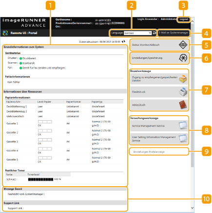 Die unten abgebildete Portalseite wird angezeigt, wenn Sie sich bei Remote UI anmelden. In diesem Abschnitt werden die auf der Portalseite angezeigten Elemente sowie die Grundfunktionen erläutert.