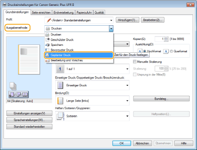 Wählen Sie [Geplanter Druck] für [Ausgabemethode] aus.