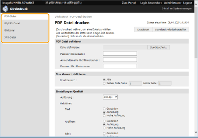 Klicken Sie auf der Portalseite auf [Direktdruck]. Remote UI-Bildschirm
