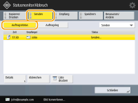 Durch Drücken auf <Details>  <Neu senden> können Sie Dokumente, die nicht gesendet/gespeichert werden konnten, erneut senden/speichern. Um ein anderes Ziel anzugeben, drücken Sie <Empfänger ändern>. Drücken Sie bei Dokumenten mit mehreren Zielen, die anhand derselben Sende-/Speichermethode angegeben wurden, auf <Rundsendeliste>, wählen Sie ein Ziel, und drücken Sie dann <Neu senden> oder <Empfänger ändern>.