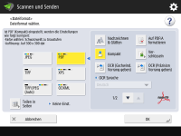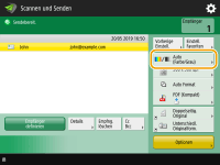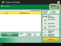 So überprüfen Sie die Gesamtanzahl der angegebenen EmpfängerDie Gesamtanzahl der angegebenen Empfänger wird oben rechts am Bildschirm angezeigt. Dadurch können Sie vor dem Senden bestätigen, dass die Anzahl der Empfänger korrekt ist. Um einen Auftrag, der gerade gesendet wird, sofort abzubrechen, gehen Sie wie folgt vor.Wenn Sie während des Sendens eines Auftrags auf dem Bedienfeld  (Stopp) drücken, erscheint die Meldung <Soll der folgende Sendeauftrag abgebrochen werden?>. Drücken Sie <Ja>, um den Sendevorgang abzubrechen. Drücken Sie bei mehreren Sendeaufträgen auf  (Stopp), um die Anzeige zur Auswahl des abzubrechenden Sendeauftrags aufzurufen. Wenn der Sendeauftrag, den Sie abbrechen möchten, nicht angezeigt wird, drücken Sie <Andere Aufträge prüf.>, um <Sendeaufträge> einzublenden. Wählen Sie den Auftrag, den Sie abbrechen möchten, und drücken Sie <Abbrechen>. So prüfen Sie den Status gesendeter/gespeicherter DokumenteWenn <Benachricht.anzeigen, wenn ein Auftrag akzeptiert ist> auf <Ein> gestellt wird, kann der <Statusmonitor/Abbruch>-Bildschirm über folgenden Bildschirm angezeigt werden, der nach Empfang eines Sendeauftrags eingeblendet wird. <Benachricht.anzeigen, wenn ein Auftrag akzeptiert ist>So drucken Sie den Bericht für die Sende-/SpeicherergebnisseWenn Sie auf der Anzeige für Grundeigenschaften des Scannens auf <Optionen>  <SE Bericht> drücken, können Sie festlegen, dass der Bericht mit den Sende-/Speicherergebnissen automatisch gedruckt wird. Um dies für jeden Auftrag von <Optionen> einzustellen, müssen Sie <Nur bei Fehler> oder <Aus> in <SE Bericht> wählen und dann <Drucken über Optionen zulassen> auf <Ein> einstellen. DateinameBeim Senden/Speichern einer Datei wird automatisch der Dateiname für die Datei im folgenden Format festgelegt. Sie können die Einstellung ändern, sodass ein anderer Name zugewiesen werden kann. Festlegen eines DateinamensBeim Senden per E-Mail Format "Auftragsnummern (vier Stellen)_Seitenzahlen (drei Stellen).Dateierweiterung", wie "1042_001.jpg" Beim Speichern in einem Dateiserver Format "Jahr, Monat, Tag, Stunde, Minute und Sekunde des Speicherzeitpunkts (14 Stellen).Dateierweiterung", wie "20151030133541.jpg" E-Mail-BetreffDer in <Standardthema> eingegebene Betreff wird automatisch festgelegt ( <Standardthema>). Wenn Sie einen anderen Betreff angeben, ändern Sie die Einstellung, oder legen Sie jedes Mal beim Senden einer E-Mail den Betreff fest ( Festlegen der E-Mail-Einstellungen). Erken. Zufuhr mehrerer Blätt. Erken. Zufuhr mehrerer Blätt. Wenn mehrere Blätter eingezogen werdenDer Scan wird gestoppt, und die Meldung wird auf dem Bildschirm angezeigt. Gehen Sie zum Beheben des Staus wie in den Anweisungen erläutert vor. Wenn der Stau behoben ist, wird der Bildschirm zum Fortsetzen des Auftrags angezeigt. Wenn das Gerät fälschlicherweise einen Mehrfacheinzug erkennt, drücken Sie <Zufuhr mehrerer Blätter nicht erkennen>, um den Scan fortzusetzen. Wenn Sie das Gerät vorab so einstellen wollen, dass Sie nicht über einen Mehrfacheinzug benachrichtigt werden, führen Sie einen der folgenden Schritte aus. Drücken Sie bei jedem Senden/Speichern eines Dokuments <Optionen> auf dem Grundfunktionsbildschirm zum Scannen  wählen Sie <Erken. Zufuhr mehrerer Blätt.>, um die Einstellung zu deaktivieren. |