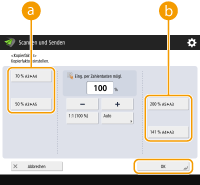 Wenn Sie den Farbmodus auf <Auto (Farbe/Grau)>, <Auto (Farbe/SW)>, <Vollfarbe>, oder <Graustufen> einstellen, können Sie Dokumente nur mit einem Kopier-(Zoom-)Verhältnis von 100% versenden. Wenn allerdings nur I-Fax-Adressen als Ziele festgelegt sind, können Sie das Kopierverhältnis unabhängig vom Farbmodus ändern.