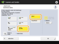 Wenn Sie derzeit die Funktion <Scannen und Speichern> verwenden, kann die Sprache für OCR nur festgelegt werden, wenn <Word> für <OOXML> gewählt wurde oder <OCR (Präzision Vorrang geben)> für <PDF> gewählt wurde.