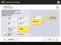 Wenn Sie <PDF> oder <XPS> als Dateiformat auswählen, können Sie <Kompakt> und <OCR (Durchsuchbarer Text)> zeitgleich festlegen. In diesem Fall wird <PDF (Kompakt)> oder <XPS (Kompakt)> als Dateiformat im Grundfunktionsbildschirm für Scannen und Senden angezeigt.