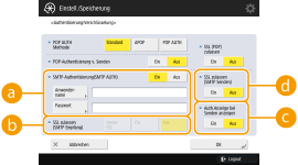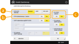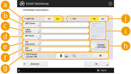 Um gescannte Dokumente ohne Umweg über einen Computer per E-Mail oder I-Fax direkt zu versenden, müssen Sie die Kommunikationseinstellungen, wie beispielsweise Mailserver, Authentifizierungsverfahren usw., einrichten. Im Allgemeinen wird ein SMTP-Server zum Senden und ein SMTP-Server oder ein POP3-Server zum Empfangen verwendet. Sie können die Codierung und andere Parameter einrichten. Näheres zu den erforderlichen Einstellungen erfahren Sie von dem Internetanbieter oder den Netzwerkadministratoren.