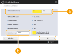 3 | Legen Sie die erforderlichen Einstellungen fest, und drücken Sie <OK>. ![]() <Administrator verwenden>Wenn Sie den Administratorzugriff verwenden, setzen Sie dies auf <Ein>. <Passwort Verschlüssel.>Wenn Sie ein Passwort verwenden, das sich von der Authentifizierung unterscheidet, deaktivieren Sie <Dasselbe Passwort wie für Authentisierung vrwenden>, drücken Sie <Passwort Verschlüssel.>, und geben Sie das Passwort ein. ![]() Wenn "Administrator" deaktiviert ist, können Sie <Einstellungen Administrator> nicht festlegen (die Einstellung von <Administrator verwenden> ist fest auf <Aus> gesetzt). |