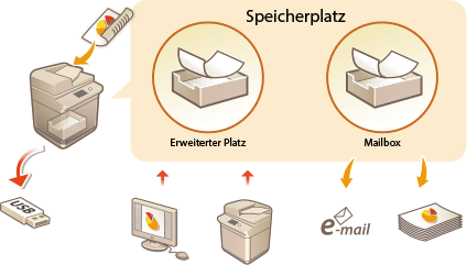 Die in diesem Gerät installierte Festplatte verfügt über "Speicherplatz" zum Speichern, gemeinsamen Nutzen und Bearbeiten von gescannten Dokumenten. Das Verbinden des Speichermediums zum Gerät liefert Ihnen einen externen Speicherplatz. Suchen und verwenden Sie den idealen Speicherplatz gemäß Ihren Bedürfnissen.