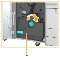 Wenn der Broschüren-Trimmer D angebracht ist, wird durch Drehen des Rads das gestaute Papier dem Einzugsriemen des Broschüren-Trimmer D zugeführt.