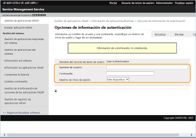 Si se cambia la aplicación de inicio de sesión, vuelva a confirmar la información de autenticación en [Establecer autenticación MEAP]. Es posible que sea necesario volver a introducir la información de autenticación. |