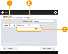 <Guardar nuevo dest.>, <Detalles/Editar> y <Eliminar> en la pantalla de <Libreta de direcciones (local)> puede utilizarse para registrar nuevos destinos, comprobar detalles y editar/eliminar destinos. Para utilizar la libreta de direcciones remotas, es necesario configurar los ajustes del equipo servidor. Establezca en abierto la libreta de direcciones remota de forma externa en el equipo servidor. |