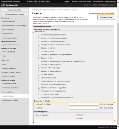 Escriba la contraseña en [Contraseña de cifrado] seleccione el nivel de seguridad en [Nivel de seguridad] haga clic en [Iniciar exportación]  [Bien].
