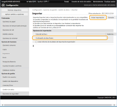 Puede exportar todos los datos de configuración del equipo y guardarlos en un ordenador, y luego importarlos al configurar las opciones en un nuevo equipo, por ejemplo al comprar uno de repuesto. Si desea configurar las mismas opciones en dos o más impresoras multifunción Canon*, basta con exportar todas las opciones desde un equipo e importarlas en todos los demás, eliminando así la necesidad de configurar cada equipo por separado. Para realizar estas operaciones, inicie una sesión en la IU remota con privilegios de Administrador.