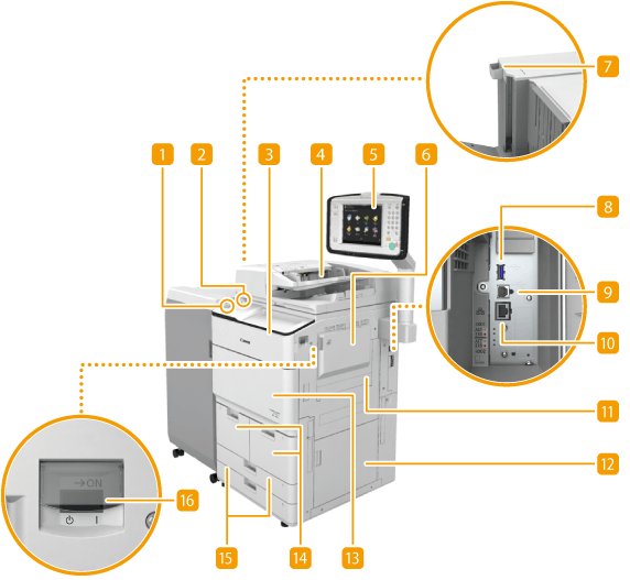可以将USB存储设备连接到位于操作面板左侧的USB端口,然后直接从USB存储设备打印数据。还可以将使用本机扫描的文档直接保存到USB存储设备。