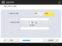 네트워크 연결 설정을 지정합니다. ![]() ![]() <IPv4 사용> 혹은 <IPv6 사용>를 위해 <설정>를 누른 후 <다음화면>를 누릅니다. IPv4와 IPv6을 모두 사용할 수 있습니다. <IPv4 사용> 및 <IPv6 사용>을<해제> 으로 누르고, <확인>를 누를 경우, 네트워크 설정을 건너뛰고 10단계로 갑니다. ![]() <IPv4 사용>를 위해 <설정>누르는 경우 다음 설정을 지정하십시오. ![]() IP 주소를 자동으로 획득하려면, <DHCP> 혹은 <자동 IP>를 누른 후 <다음화면> 또는 <확인>를 누르십시오. IP 주소를 수동으로 설정하려면 <DHCP> 또는 <자동 IP>에 대한 선택을 해제하고, <IP주소>, <서브넷 마스크> 및 <게이트웨이 주소>를 눌러 각 값을 입력한 후 <다음화면> 또는 <확인>을 누릅니다. IPV4 주소 설정에 대한 정보는 IPv4 주소 설정을 참조하십시오. ![]() <IPv6 사용>를 위해 <설정>누르는 경우 다음 설정을 지정하십시오. ![]() 스테이트리스 주소를 사용하려면 <설정>를 누르거나 스테이트리스 주소를 사용하지 않으려면 <해제>를 누른 후, <다음화면>를 누릅니다. IPv6 주소에 대한 정보는 IPv6 주소 설정를 참조하십시오. ![]() 스테이트리스 주소를 지정한 후 다음 설정을 지정합니다. ![]() 수동 주소를 사용하려면 <설정>를 누르거나 수동 주소를 사용하지 않으려면 <해제>를 누른 후, <다음화면>를 누릅니다. 수동 주소를 사용하려면 <수동 주소>, <프리픽스 길이>를 누른 뒤 <기본 라우터 주소>를 눌러 각 값을 입력합니다. ![]() 수동 주소를 지정한 후 다음 설정을 지정합니다. ![]() DHCPv6를 사용하려면 <설정>를 누르거나 DHCPv6를 사용하지 않으려면 <해제>를 누른 후, <확인>를 누릅니다. | |