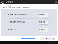 네트워크 사용자 리스트, 팩스 사용자 데이터 리스트 및 조정값 리스트를 인쇄할 수 있습니다. ![]() ![]() 인쇄하려는 리포트에 대해 <인쇄 시작>를 누릅니다. 인쇄가 완료되거나 리스트를 인쇄하지 않는 경우 <확인>를 누릅니다. | |