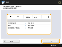 如果對於 <叫回時顯示確認螢幕> 和 <叫回時開始操作(按下按鈕時開始操作。)> 選擇 <開啟>,則在選擇確認畫面上的 <是> 後,將開始影印。