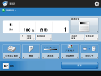 顯示影印倍率、紙張尺寸、份數等設定狀態。請務必確認此處的設定,以確保影印正常進行。若要變更設定,請按下顯示區域下方的按鈕。