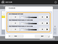 設定為<濃>端時,以最大濃淡度列印的區域會增加。設定為<少量>端時,列印的填滿區域、文字和線條看似缺少點的半色調。此設定主要用於調整中間濃淡度。