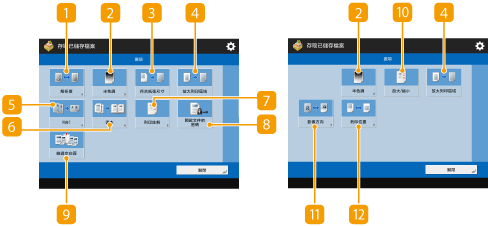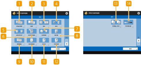 按 <主功能表> 畫面上的 <存取已儲存檔案>,然後按 <郵件信箱>、<進階郵件信箱>、<網路> 或 <記憶介質> 可列印檔案,隨即顯示下列設定畫面。