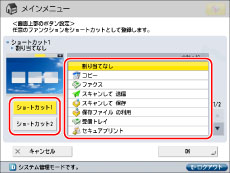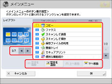 ファンクションボタンの数が<メインメニューのボタン表示設定>で設定されたレイアウトボタン数より多い場合は、メインメニュー画面の2ページ目以降に表示されます。メインメニュー画面に表示できるボタン数は最大16個です。