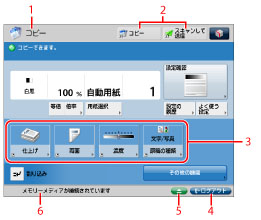 [「その他の機能」のショートカット登録]:各ファンクション画面に表示する[その他の機能]のショートカットボタンを登録します。コピー画面の場合は、[その他の機能]だけでなく[よく使う設定]もショートカットボタンに登録できます。登録したショートカットボタンは、各ファンクション画面に表示されます。