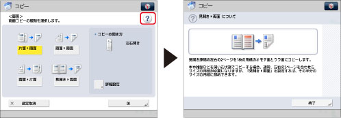 タッチパネルディスプレーにが表示されたときは、機能の詳細な説明や設定方法を確認できます。