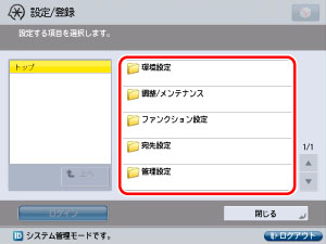 インターネットファクス(Iファクス)、Eメール、ファクスの転送設定、アドバンスドボックス等のネットワークを利用した機能を使用する前に設定します。セキュリティー関連の機能を使う際には、主にここから使用します。階層構成になっており、目的別にグルーピングされております。
