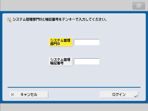 工場出荷時、本製品にはシステム管理者情報(システム管理部門ID/システム管理暗証番号)が設定されています。そのため、管理者は、設定/登録画面でシステム管理部門IDとシステム管理暗証番号を入力してログインする必要があります。システム管理部門IDとシステム管理暗証番号の初期値は、それぞれ「7654321」に設定されています。変更してご使用ください。