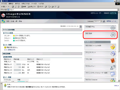 (設定/登録)→ [環境設定]→[ネットワーク]→[TCP/IP設定]→[HTTPを使用]でHTTPをONにする。