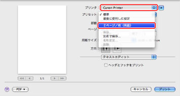 お使いのプリンターを選択したあと、[プリセット]で[2ページ/枚(両面)]を選択します。