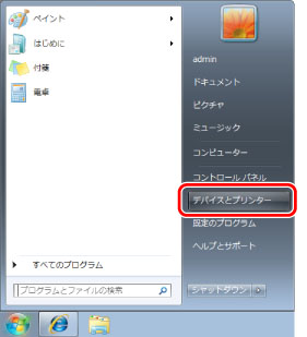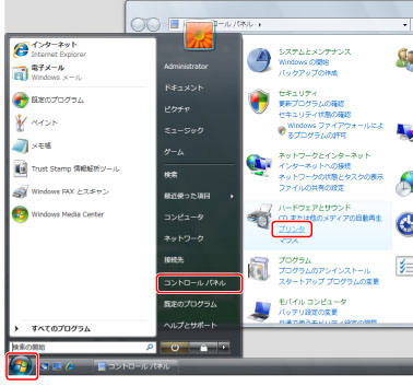 ](スタート)→[コントロールパネル]→[プリンタ]を選択します。Windows 7の場合は、[
