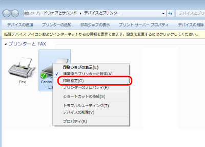 デフォルト値を設定するプリンターのアイコンを右クリックして、[印刷設定]をクリックします。