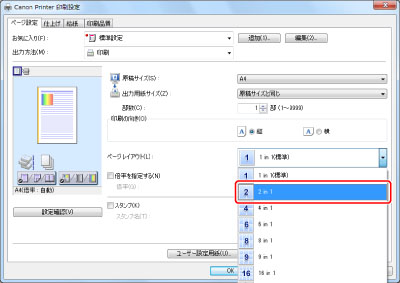 [ページ設定]ページの[ページレイアウト]から[2 in 1]を選択します。